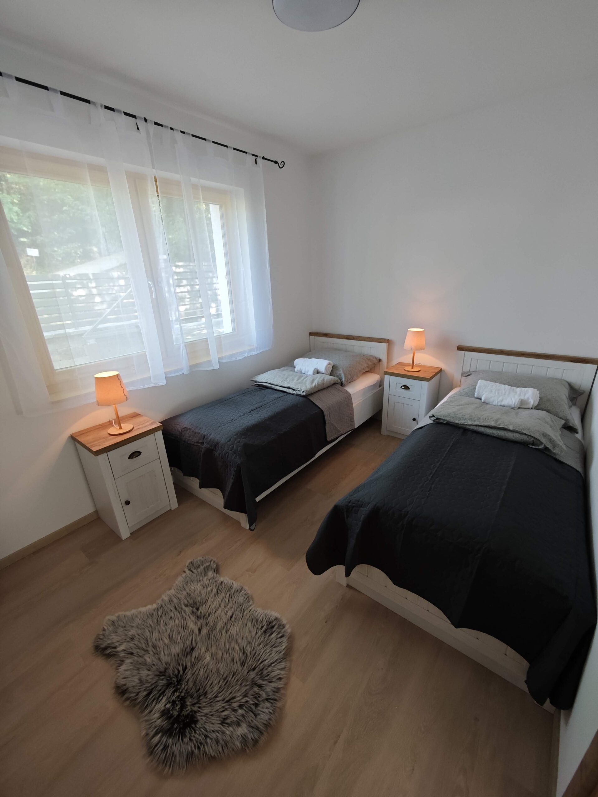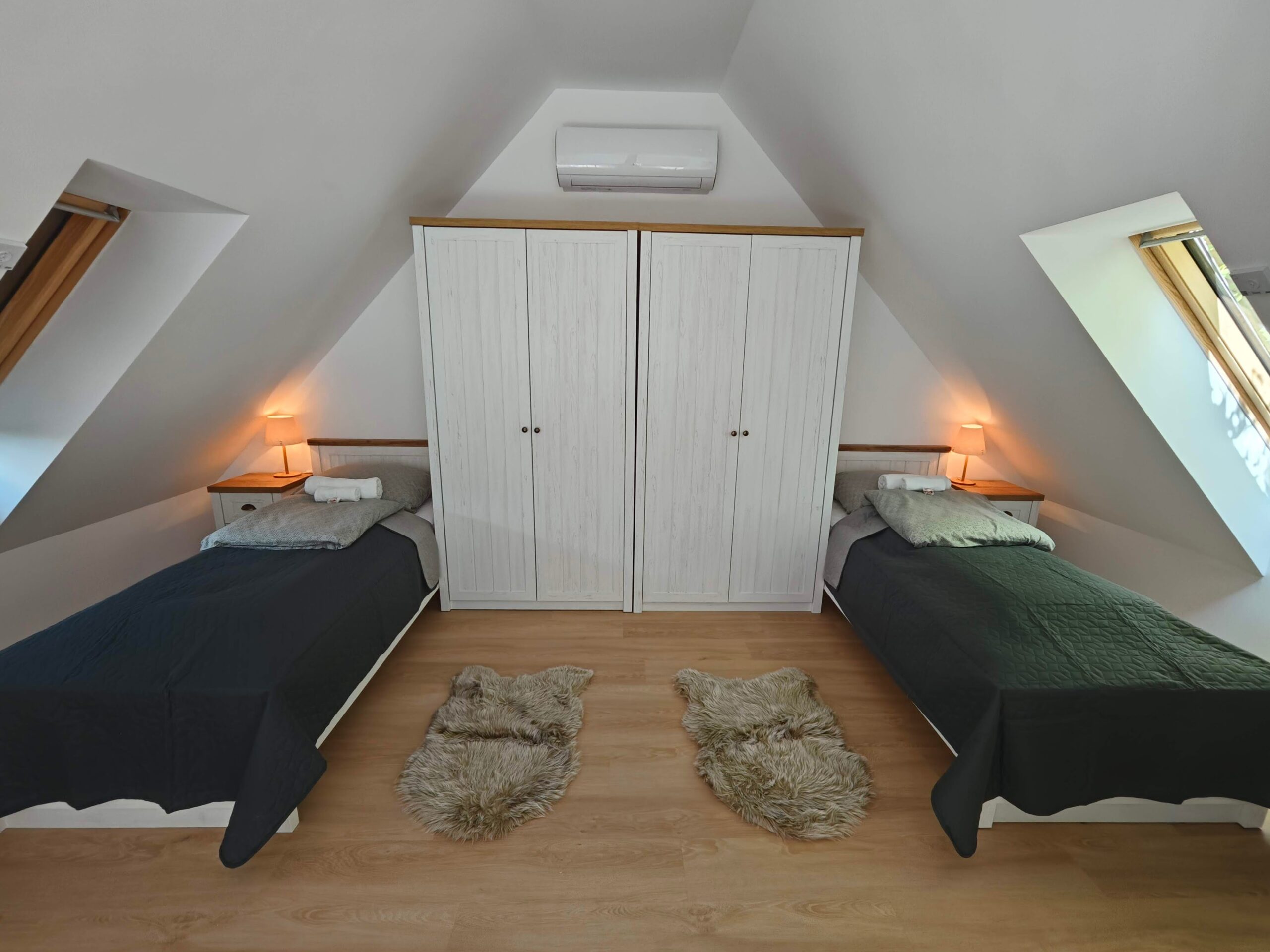 A földszinti kétágyas hálószoba 2 különálló ággyal és világos hangulatával ideális a család fiatalabb tagjainak vagy baráti társaságoknak. A praktikus bútorozás – íróasztal és tágas szekrény – lehetővé teszi, hogy hosszabb tartózkodás esetén is otthonosan berendezkedj. Letisztult, barátságos hangulatával ideális választás barátoknak, testvéreknek vagy kollégáknak is.